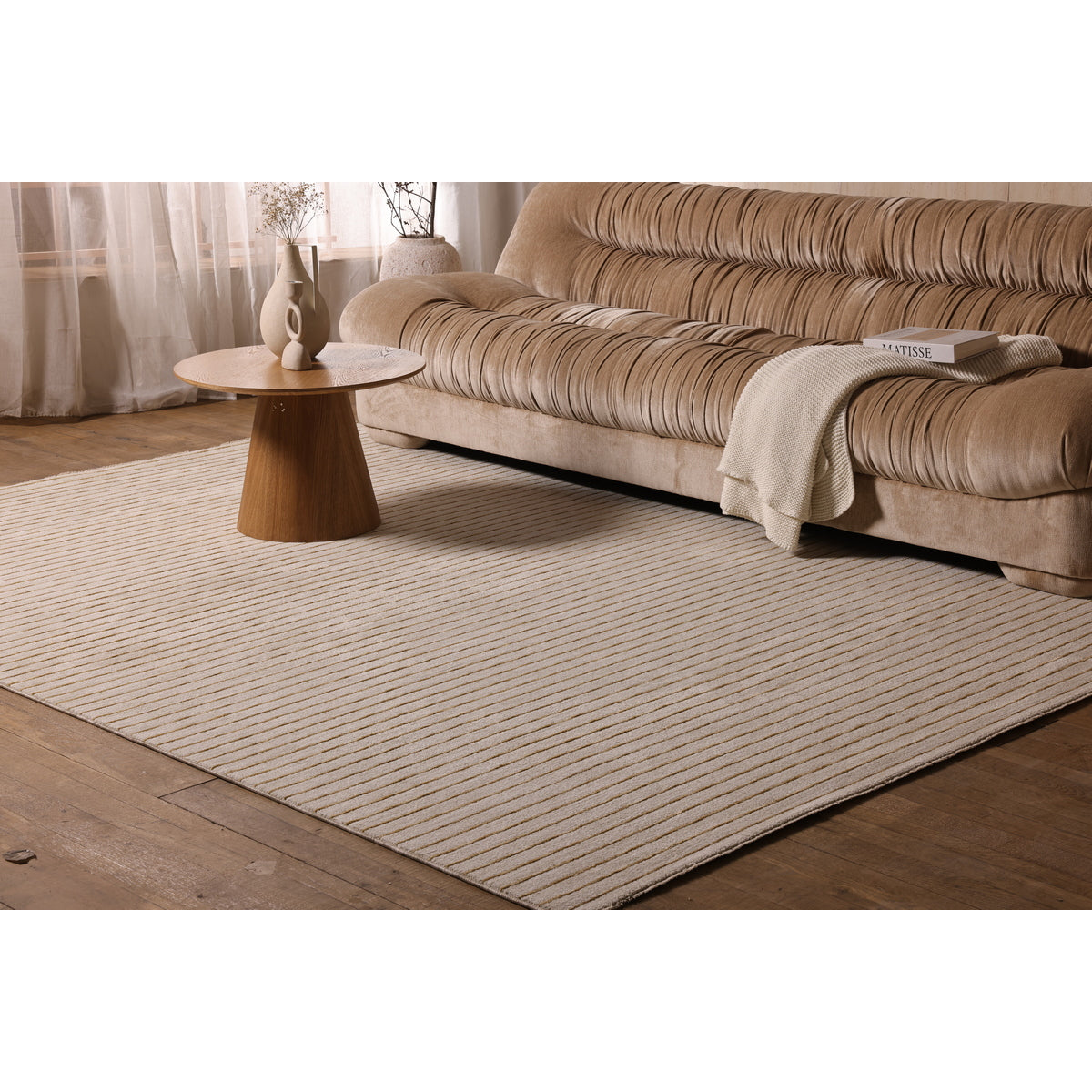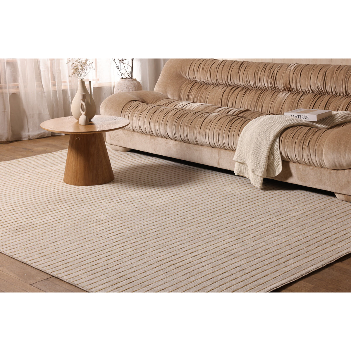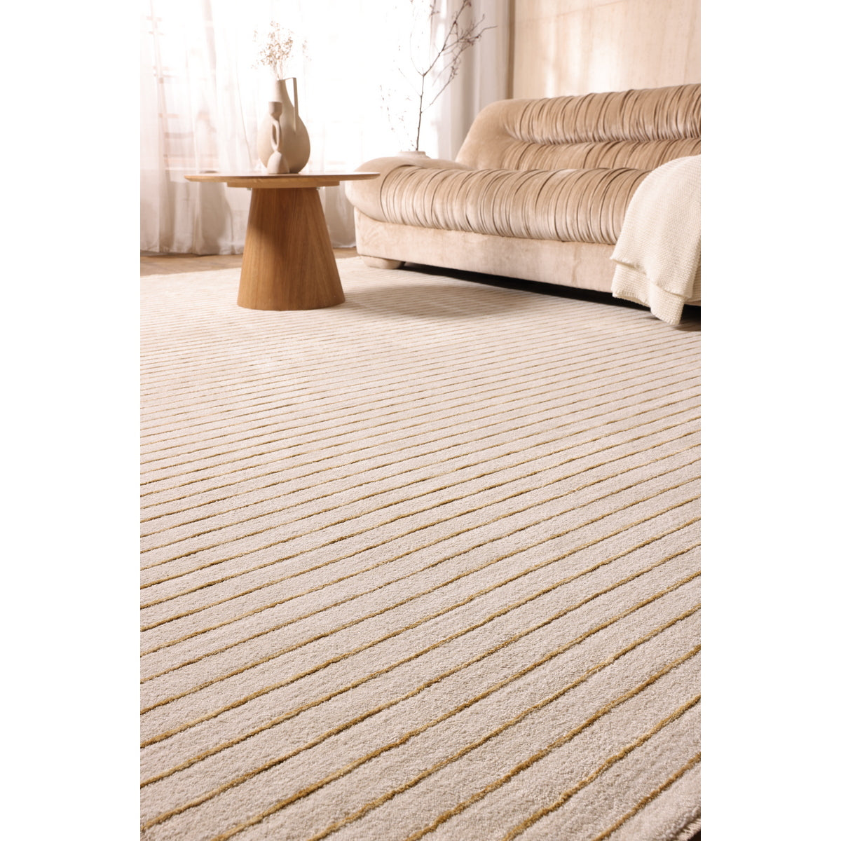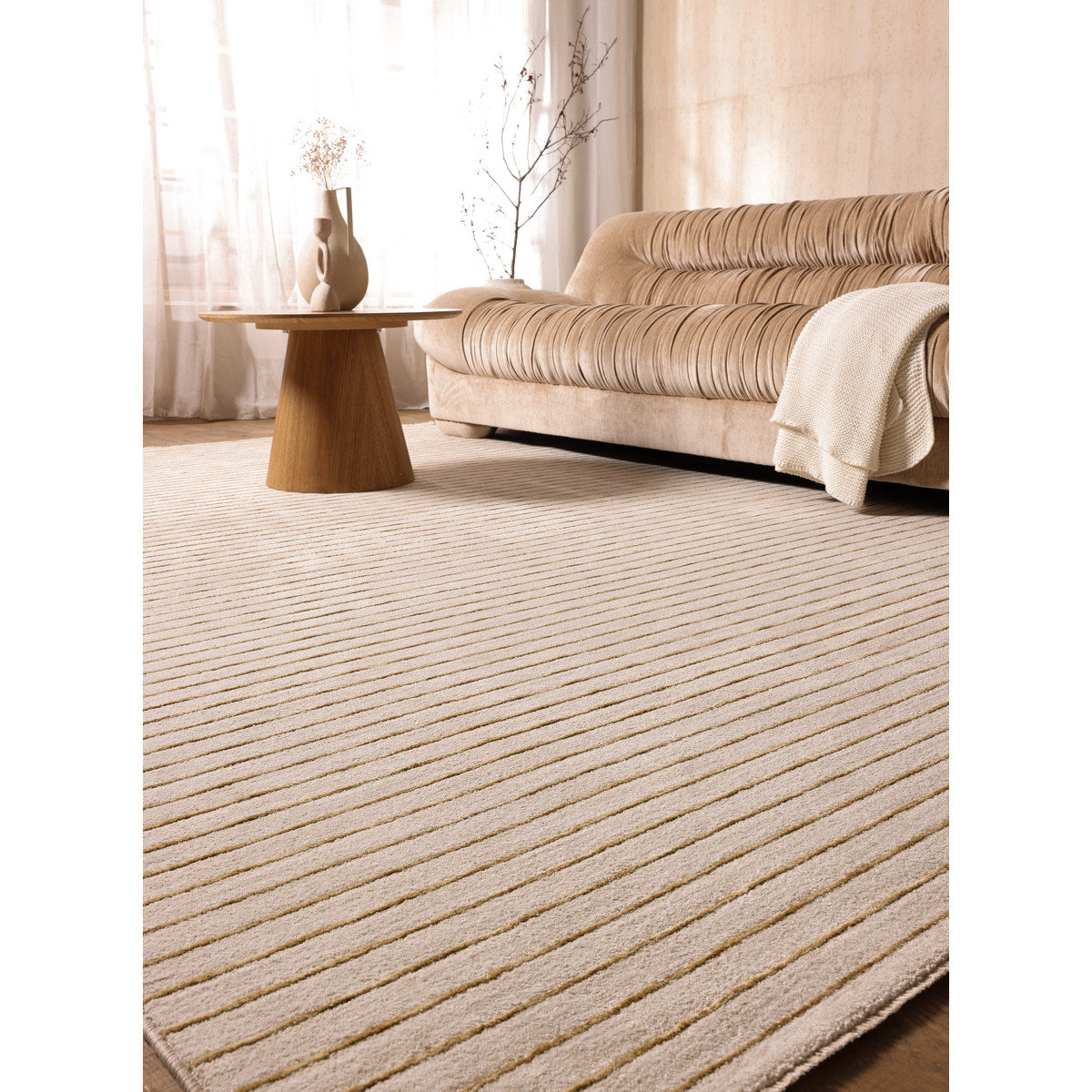 קולקציית בוקלט מציעה פרשנות נקייה ועכשווית לעיצוב, עם דגש על מרקם, קו וקצב. השטיחים בסגנון מינימליסטי רגוע ויוצרים נוכחות שקטה ומאוזנת בחלל. הקולקציה כוללת שני דגמים, דגם אחד מתאפיין בקווים עדינים וסדורים היוצרים תחושת סדר ורוגע, בעוד הדגם השני מציג טקסטורה חופשית ורכה יותר, עם תנועה עדינה על פני השטח. שני הדגמים נשענים על פלטת צבעים טבעית של גווני שמנת, חול אבן וזהב המדגישה מראה נקי ומרענן. בוקלט משתלבת בהרמוניה בחללים מודרניים ומינימליסטיים, ומוסיפה עומק ועניין מבלי להעמיס. מתאימה לסלון, חדרי שינה ולמרחבים המעוצבים בקו רגוע ומדויק.